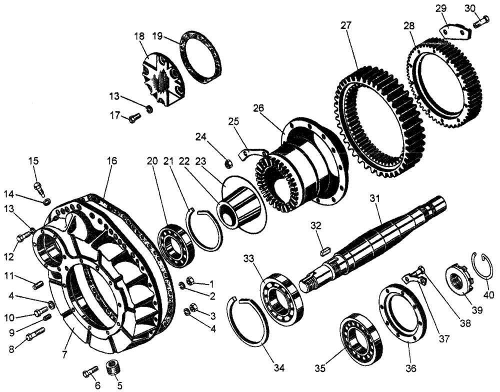 Детали бортового редуктора на Т10М (кожух, полуось, подшипники, ступица, шестерни)