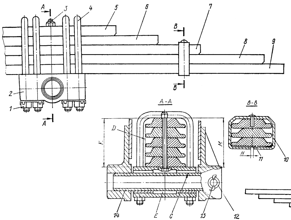 Заварите концы стяжек рессоры в местах стыка электросваркой. Высота шва не должна превышать 3 мм. Повреждение листов рессоры электросваркой не допускается. Полость Е заполните графитной смазкой.