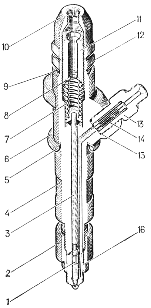 5. Спаренные и притертые детали — корпус распылителя и игла — невзаимозаменяемы. Замена одной из этих деталей на деталь другого комплекта не допускается. Иглу и корпус распылителя соединяйте только после промывки в чистом бензине и смачивания в чистом профильтрованном дизельном топливе. Для лучшей очистки от нагара распылитель помещайте в-ванночку с бензином на длительное время. Распиливающие отверстия в распылителе прочищайте чистиком-иглой диаметром 0,3 мм.