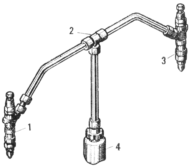 Присоедините эталонную 1 ( рис. 151 ) и проверяемую 3 форсунки к секции 4 насоса через тройник 2, а рычаг акселератора установите в положение максимальной подачи топлива. Отсоедините остальные три форсунки от секций топливного насоса. Проверьте давление впрыска топлива форсункой, вращая коленчатый вал дизеля.