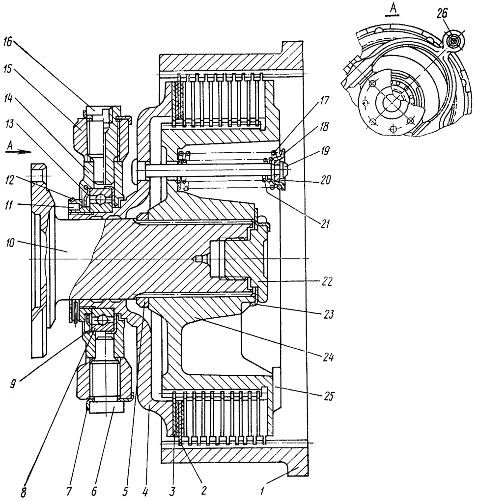 Установите на бортовой фрикцион приспособление ( рис. 234 ) и сожмите пружины. Выньте из выточек пальцев 19 ( см. рис. 232 ) сухари 20. Медленно поднимите шток приспособления до полного разжатия пружин 17 и 21, снимите тарелки 18 и пружины. Установите бортовой фрикцион на торец внутреннего барабана 24 и снимите нажимную тарелку 4, кольцо 5 и диски 2 и 5 с наружными и внутренними зубьями. Снимите замковое кольцо 12, отверните гайку 11 с нажимной тарелки и спрессуйте корпус 14 упорного подшипника 8 с подшипником в сборе с нажимной тарелки. Снимите замковое кольцо 9 и отражатель 13. Выпрессуйте упорный подшипник из корпуса стержнем диаметром 5 мм через два отверстия в корпусе.