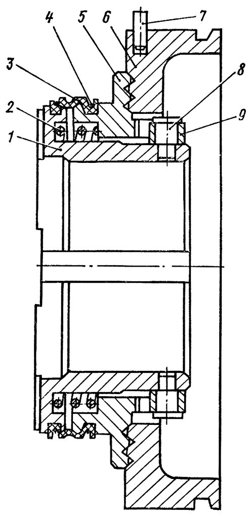 Снимите с уплотнения диск 6 ( рис. 243 ). Сожмите уплотнение и снимите проволоку 4 с манжеты 3. Выпрессуйте два пальца 8 с сухарями 9 из втулки 1. Разожмите уплотнение и разъедините втулку с диском 5. Снимите с втулки пружину 2.