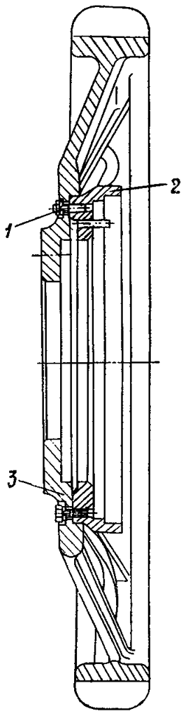 Лабиринт в сборе ( см. рис. 244 ) устанавливается непосредственно на ведущее колесо 3 ( рис. 245 ) и закрепляется на шпильках лабиринта 2 гайками 1 с пружинными шайбами. Момент затяжки гаек 40...60 Н • м (4...6 кгс • м).