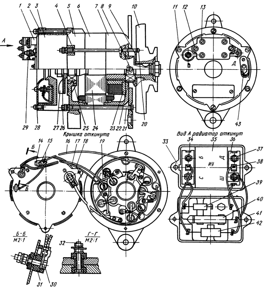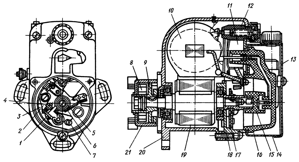 В корпус 20 из цинкового сплава залиты полюсные башмаки. В гнездо с внутренней стороны корпуса запрессовано наружное кольцо шарикоподшипника. На корпусе смонтирована дистанционная клемма выключения зажигания.