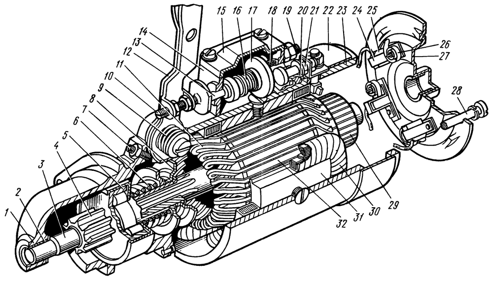 Стартер состоит из корпуса 23 (рис. 101) с полюсными башмаками 31 и обмоткой возбуждения 30, якоря 32 с обмоткой 11 и коллектором 29, крышек с подшипниками скольжения, щеткодержателя 24 со щетками, механизма привода с шестерней 4 и включателя 14. Привод служит для соединения шестерни 4 вала 3 якоря с зубчатым венцом маховика пускового двигателя во время его пуска и разъединения вала стартера с венцом маховика, когда двигатель начнет работать.