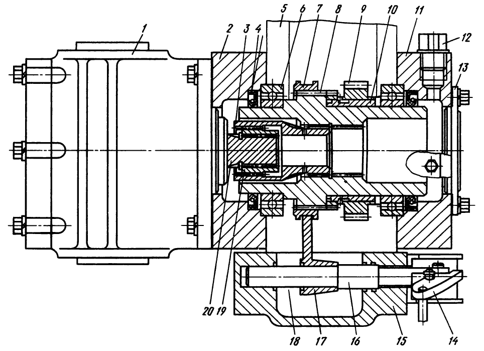 К задней стенке корпуса муфт, поворота крепятся кронштейны 2 и 4, к нижним полкам которых присоединена изогнутая площадка 1 с пятью отверстиями для фиксации прицепной серьги 8. Передний конец прицепной серьги шарнирно закреплен на оси в кронштейне 11, установленном в передней части корпуса муфт поворота. Ось стопорится от проворачивания планкой 10, входящей в прорезь на оси.